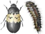 Odrasli kornjaš je ovalnog oblika, crno-smeđe boje i ima karakterističnu žućkastu traku s po tri tamne točkice na prednjim krilima. Ličinka je dlakava i tamne boje, a može narasti do 1,5 cm.